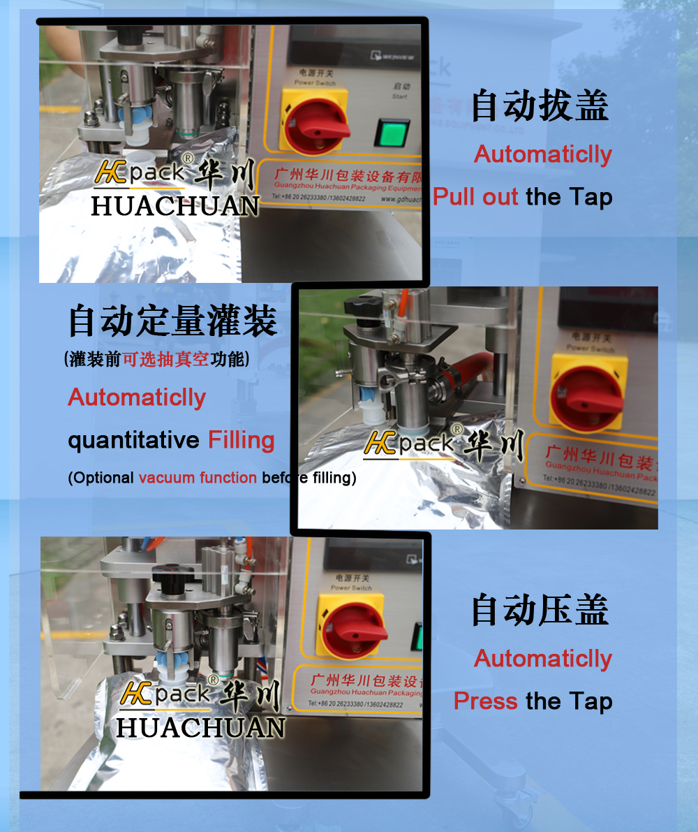 人工上袋至卡位→啟動開關(guān)→自(zì)動(dòng)拔蓋→自動灌裝→自動壓蓋→人工出袋→人工裝(zhuāng)箱
